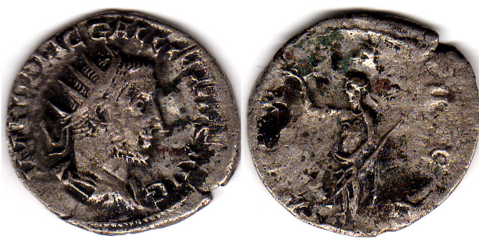 Au fil du temps, la dévaluation est de plus en plus rapide. Sous Septime Sévère, le titre du denier passe de 70% à 50% d'argent. Vers 215, Caracalla, qui a besoin d'argent pour pouvoir payer les soldats dont il a augmenté la solde, institue une nouvelle monnaie, un double denier appelé Antoninien ne pesant le poids que d'un denier et demi avec un titre de 50 % d'argent. Cette monnaie dont on ignore quel fut son nom à l'époque, se reconnait à la couronne de l'empereur faite de rayons (couronne radiée en général), et sur les monnaies des impératices au fait que le buste est placé sur un croissant de lune. Mais la couronne radiée se retrouve aussi sur des deniers, et c'est le poids qui dit si on a affaire à un double denier de poids 1 1/2, ou a un denier de poids 1.