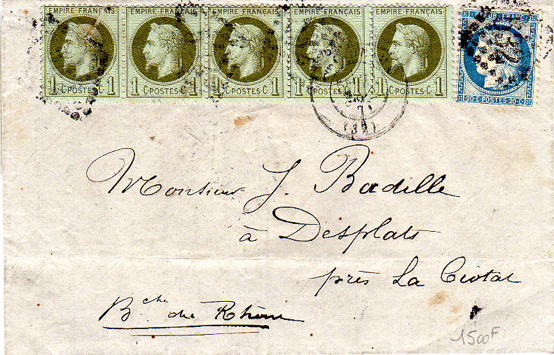 Lot description: TIMBRES lettre composée d'un N°25 1 cts bronze Empire lauré en bande de 5, oblitération du 22 septembre 1871, avec un N°37 20cts bleu, affranchissement mixte du gouvernement de Thiers, siège de Paris. Marseille à la Ciotat |