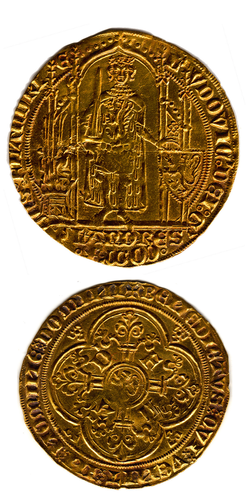 LOWLANDS, Flanders. Louis II de Mâle. 1346-1384. AV Flandre d'Or (3.91 gm). Ghent mint. Struck 1369-1370. Duke standing facing within Gothic portal, holding long sword and shield; crown to left / Cross fleury on quadrilobe. De Mey 204; Delmonte 464; De Mey, d'Or 815. Good VF, very nice detail on armor. ($7000)