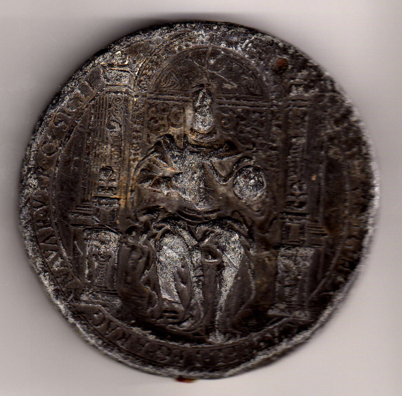 il est traversé d'un ruban encore visible de couleur rouge, verte et jaune (cordon tressé) de 5mm de diamètre. Ce ruban était brulé, ce qui explique l'absence de parchemin. Le plomb étant assez maléable, les parties en relief sont légèrement écrasées. L'état général est très beau.